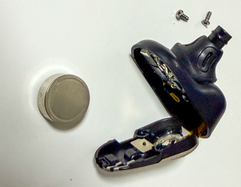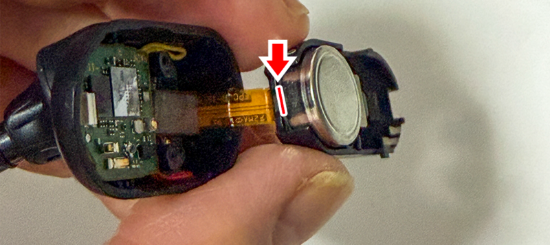 ネジを外すとネジで止まっていた部分と分離します。この2つはフラットケーブルで繋がっているので切らないように注意が必要です。画像の赤いラインの部分にヘラを入れてボタン電池型の充電池を外します。ヘラはできるだけプラスチックのものがいいと思います。金属製のドライバーなどを突っ込むと傷つくのと、バッテリーがショートする可能性もあります。