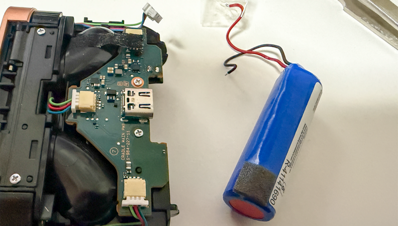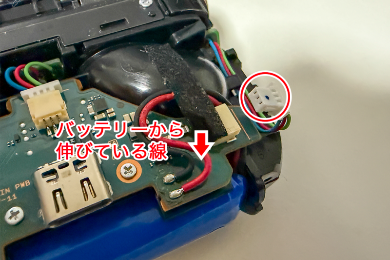 バッテリーから伸びている2本の線は基板の下を通って基板の上に回りハンダで基板に繋がっています。画像の丸で囲ったコネクターはバッテリーの線を取り回すのに邪魔なので外しておきます。バッテリーから伸びてる赤と黒の線が基板のどこと繋がっていたかを把握するため写真を撮っておくのが無難です。間違えて逆につなげると最悪壊れるかもしれません。