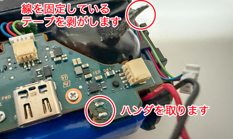 バッテリーと基板をつなげているハンダを取って、バッテリーから伸びている線を固定している黒いテープの片方側を剥がします。